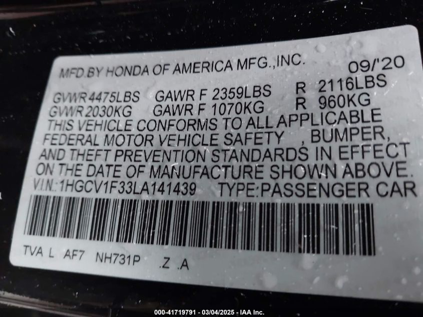 2020 HONDA ACCORD 2020 року Бензин, 1.5, Передний привод, vin - 1HGCV1F33LA****** из США