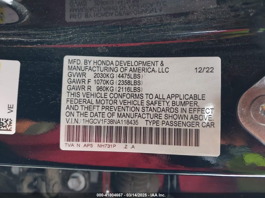 2022 HONDA ACCORD 2022 року Бензин, 1.5, Передний привод, vin - 1HGCV1F38NA****** из США