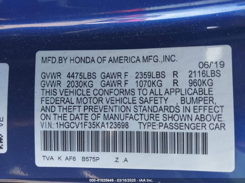 2019 HONDA ACCORD 2019 року Бензин, 1.5, Передний привод, vin - 1HGCV1F35KA****** из США