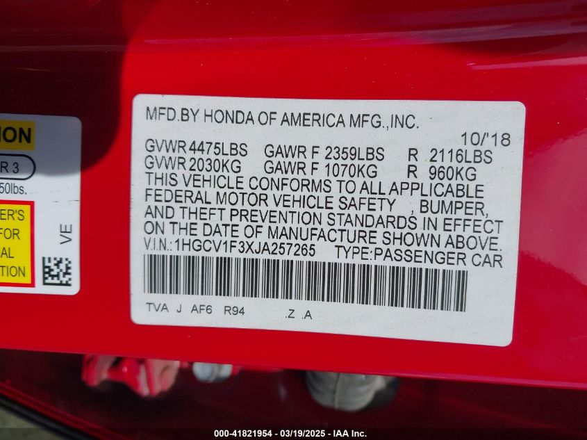 2018 HONDA ACCORD 2018 року Бензин, 1.5, Передний привод, vin - 1HGCV1F3XJA****** из США