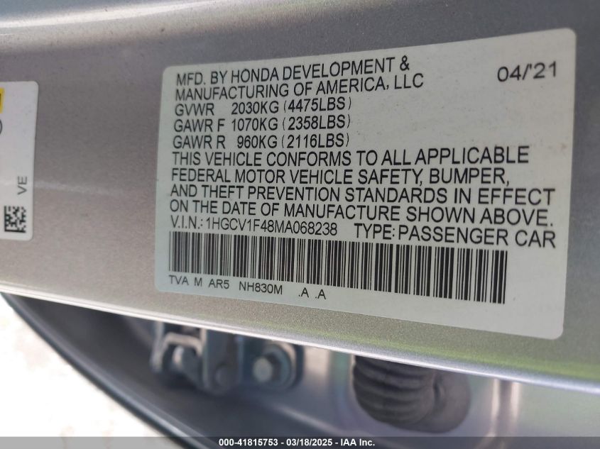 2021 HONDA ACCORD 2021 року Бензин, 1.5, Передний привод, vin - 1HGCV1F48MA****** из США
