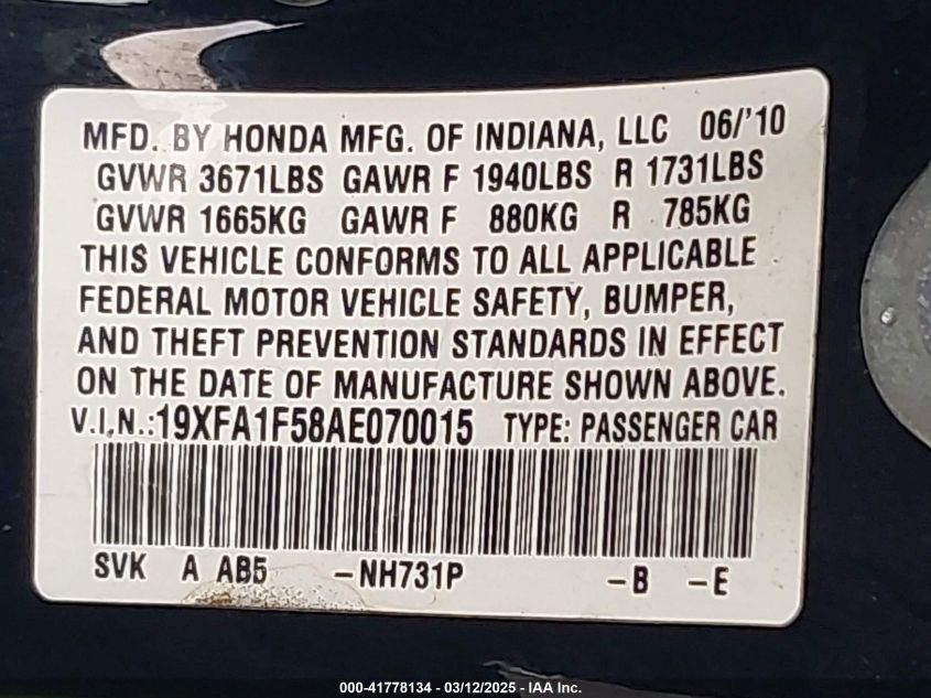 2010 HONDA CIVIC 2010 року Бензин, 1.8, Передний привод, vin - 19XFA1F58AE****** из США