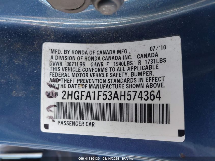 2010 HONDA CIVIC 2010 року Бензин, 1.8, Передний привод, vin - 2HGFA1F53AH****** из США