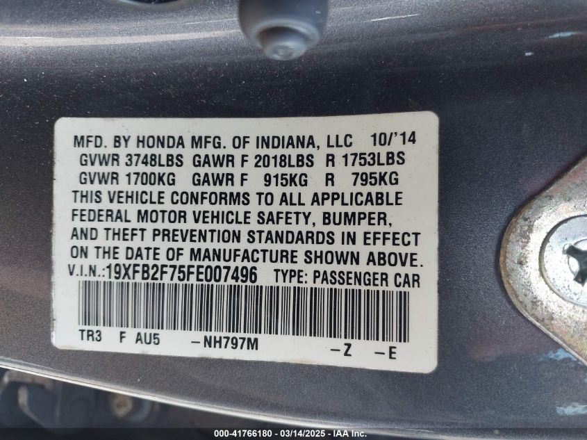 2015 HONDA CIVIC 2015 року Бензин, 1.8, Передний привод, vin - 19XFB2F75FE****** из США