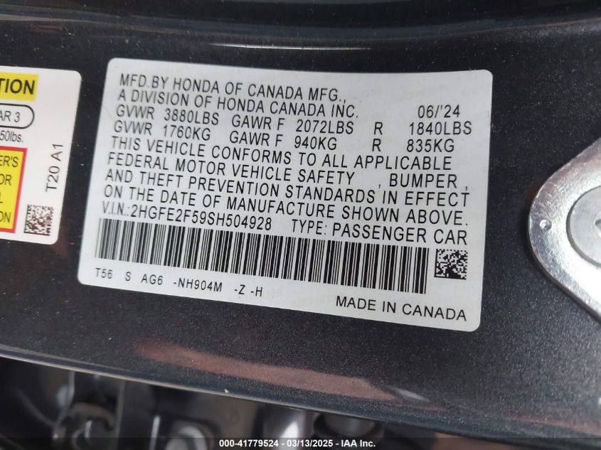 2025 HONDA CIVIC 2025 року Бензин, 2.0, Передний привод, vin - 2HGFE2F59SH****** из США