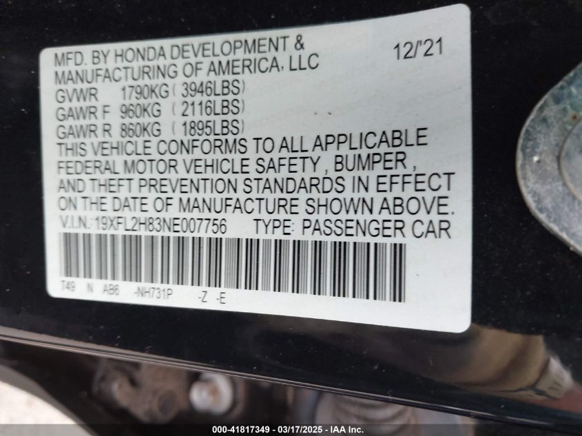 2022 HONDA CIVIC 2022 року Бензин, 2.0, Передний привод, vin - 19XFL2H83NE****** из США