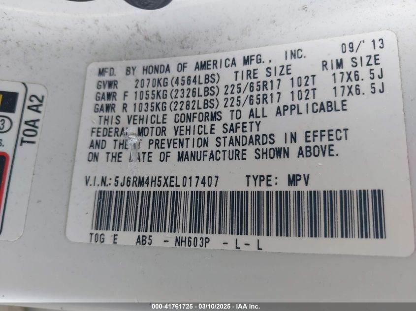 Цвет БелыйЦилиндры 4Привод Полный приводVIN 5J6RM4H5XEL******Состояние НеизвестноПовреждения Передняя или задняя AutoRIA