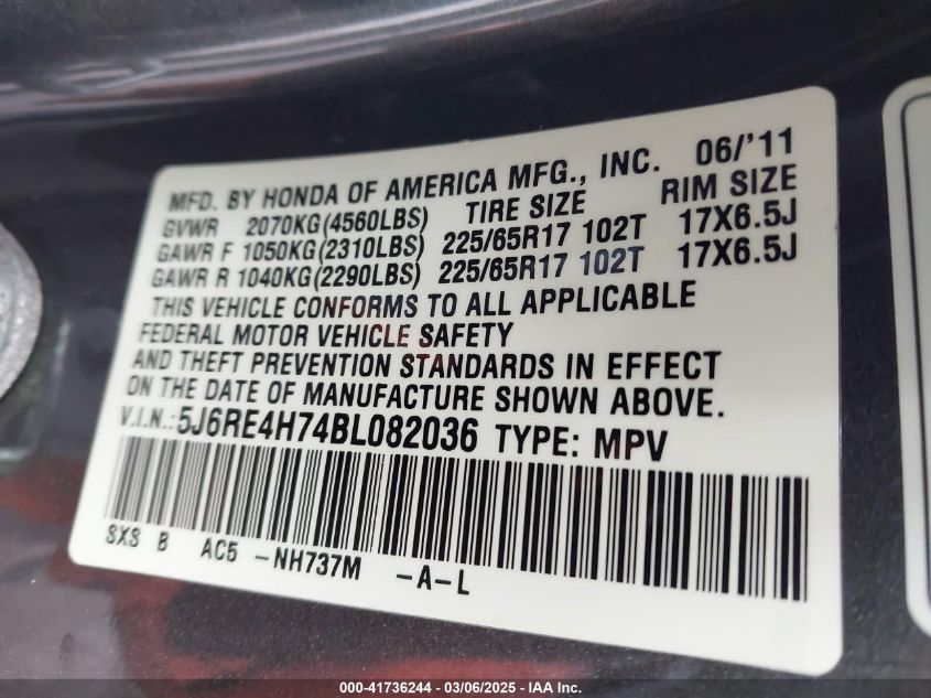 Цвет СерыйЦилиндры 4Привод Полный приводVIN 5J6RE4H74BL******Состояние НеизвестноПовреждения Передняя левая AutoRIA