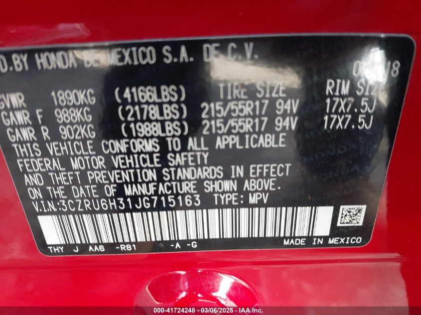 Цвет КрасныйЦилиндры 4Привод Полный приводVIN 3CZRU6H31JG******Состояние НеизвестноПовреждения Передняя или задняя AutoRIA