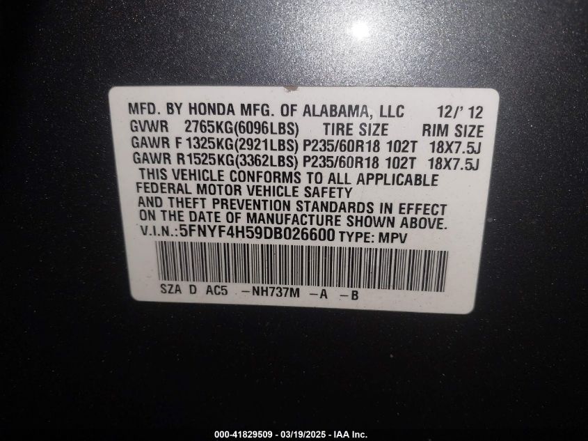Цвет СерыйЦилиндры 6Привод Полный приводVIN 5FNYF4H59DB******Состояние НеизвестноПовреждения Передняя или задняя AutoRIA