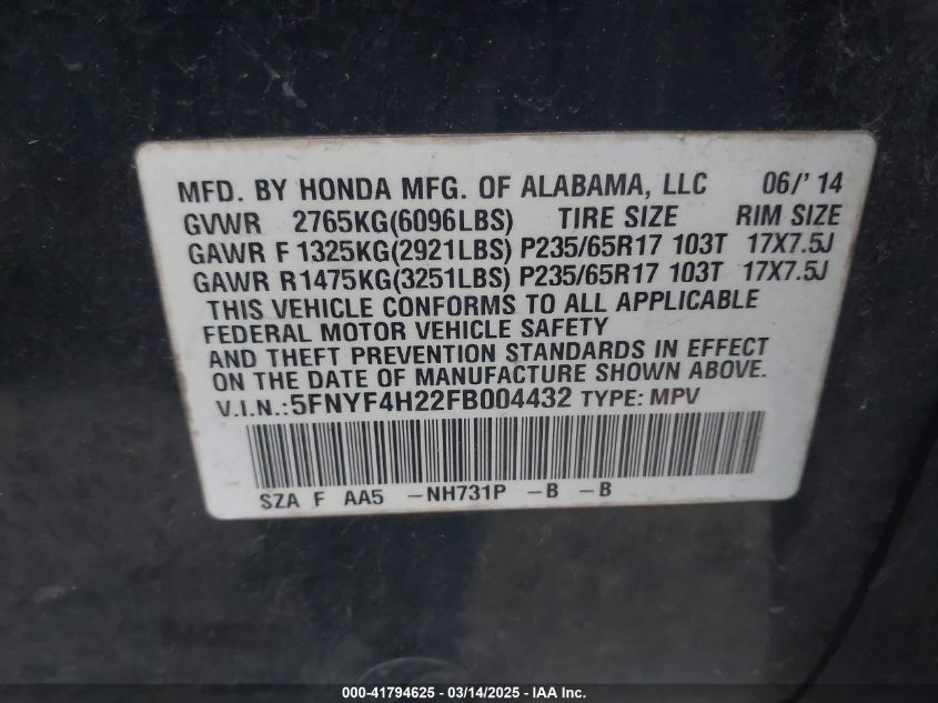 2015 HONDA PILOT 2015 року Бензин, 3.5, Полный привод, vin - 5FNYF4H22FB****** из США