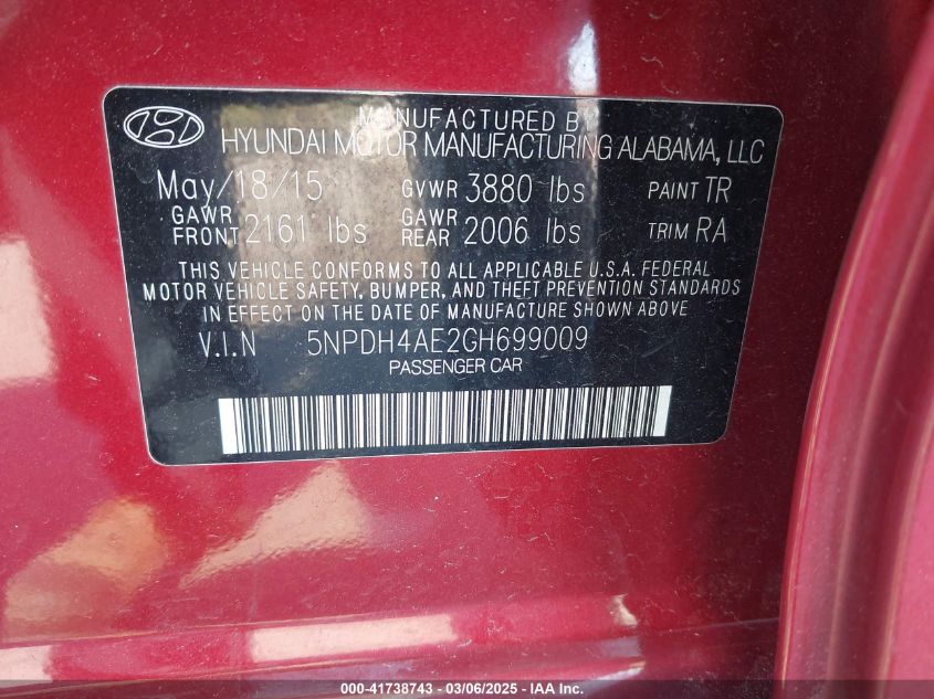 Цвет КрасныйЦилиндры 4Привод Передний приводVIN 5NPDH4AE2GH******Состояние НеизвестноПовреждения Передняя леваяДата аукциона 2025-03-26 AutoRIA