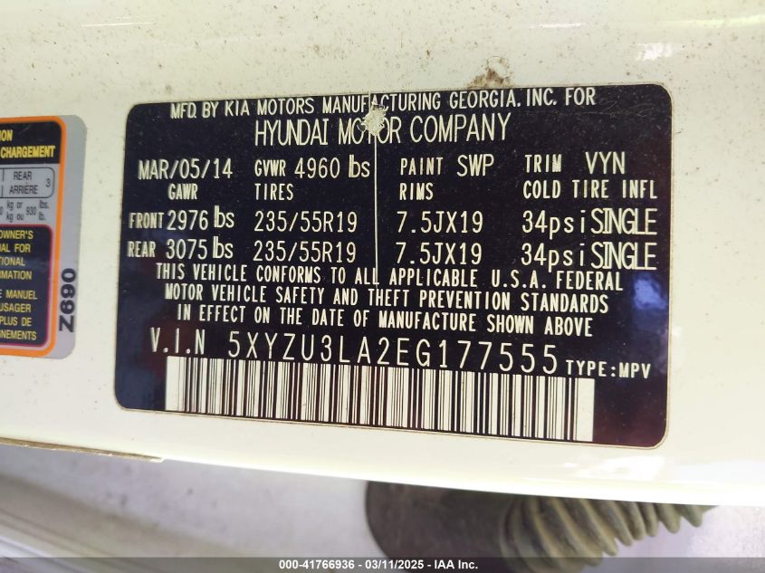 2014 HYUNDAI SANTA FE 2014 року Бензин, 2.0, Передний привод, vin - 5XYZU3LA2EG****** из США