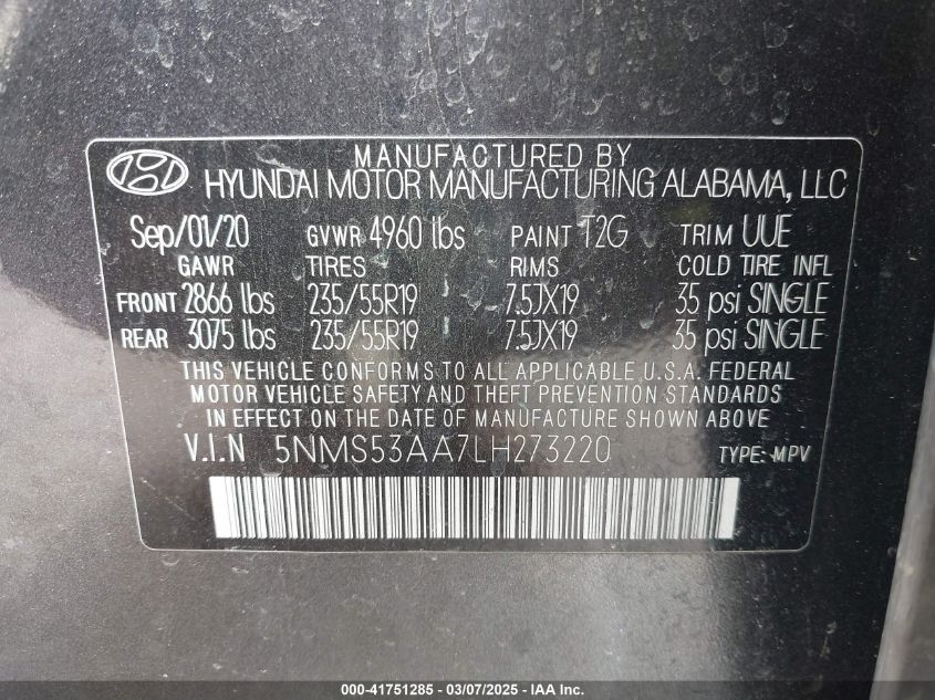 2020 HYUNDAI SANTA FE 2020 року Бензин, 2.0, Передний привод, vin - 5NMS53AA7LH****** из США