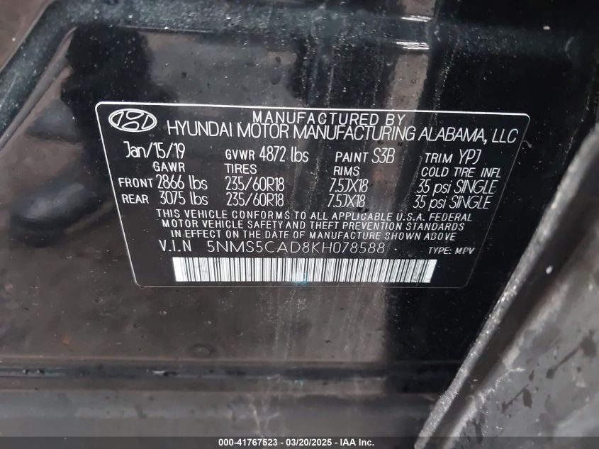 2019 HYUNDAI SANTA FE 2019 року Бензин, 2.4, Полный привод, vin - 5NMS5CAD8KH****** из США