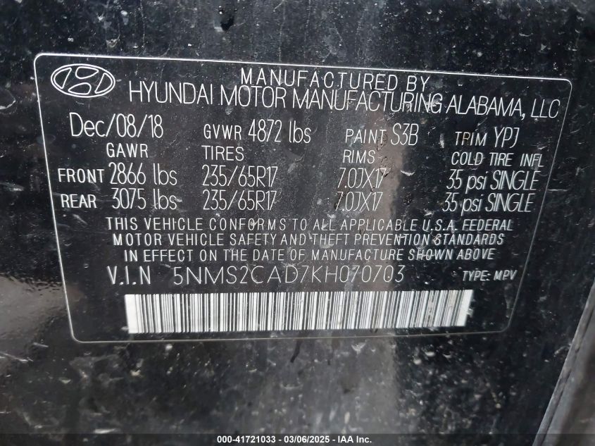 2019 HYUNDAI SANTA FE 2019 року Бензин, 2.4, Полный привод, vin - 5NMS2CAD7KH****** из США