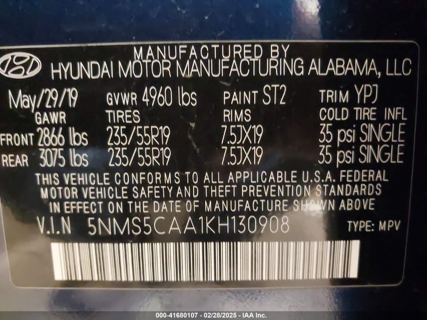 2019 HYUNDAI SANTA FE 2019 року Бензин, 2.0, Полный привод, vin - 5NMS5CAA1KH****** из США
