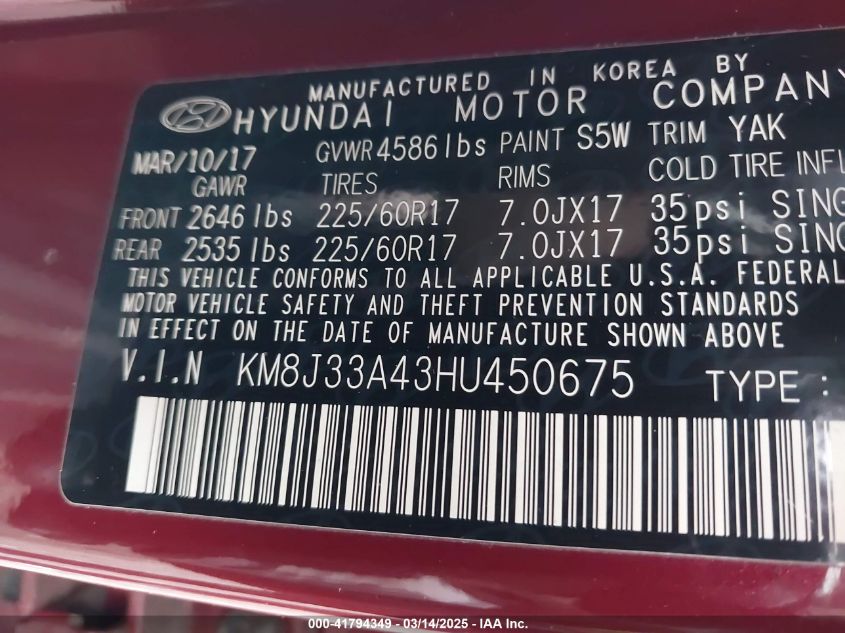 2017 HYUNDAI TUCSON 2017 року Бензин, 2.0, Передний привод, vin - KM8J33A43HU****** из США