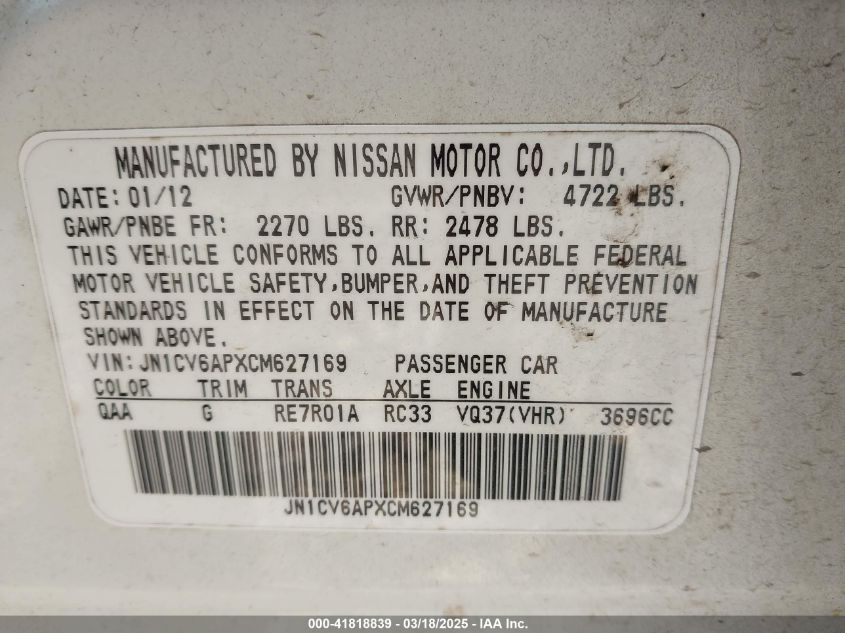 Цвет БелыйЦилиндры 6Привод Задний приводVIN JN1CV6APXCM******Состояние НеизвестноПовреждения Передняя или задняя AutoRIA