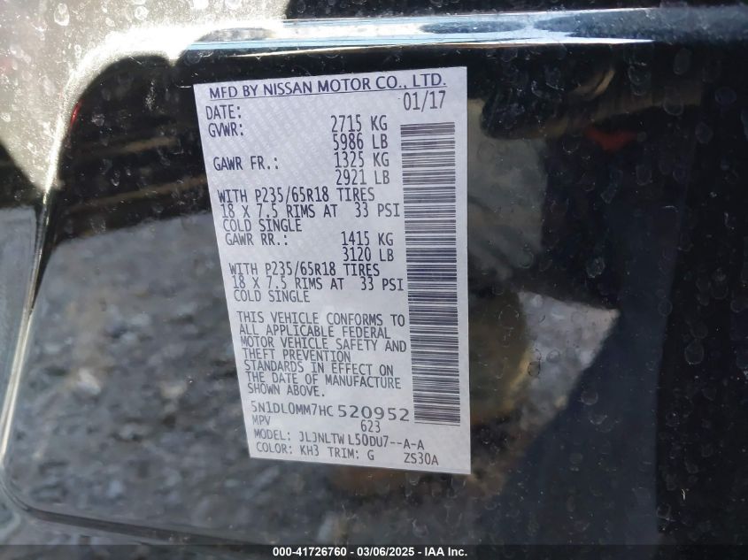 Цвет ЧерныйЦилиндры 6Привод Полный приводVIN 5N1DL0MM7HC******Состояние НеизвестноПовреждения Передняя или задняя AutoRIA
