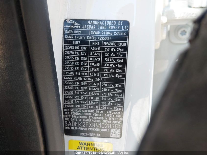 2022 JAGUAR E-PACE 2022 року Бензин, 2.0, Полный привод, vin - SADFK2FX8N1****** из США
