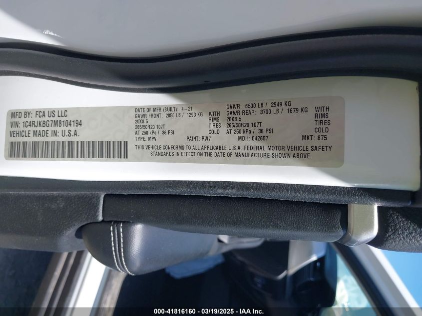 Цвет БелыйЦилиндры 6Привод Полный приводVIN 1C4RJKBG7M8******Состояние НеизвестноПовреждения Передняя или задняя AutoRIA