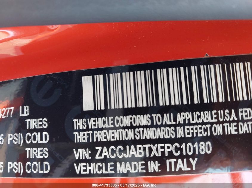 Цвет АпельсиновыйЦилиндры 4Привод Передний приводVIN ZACCJABTXFP******Состояние НеизвестноПовреждения Передняя или задняя AutoRIA