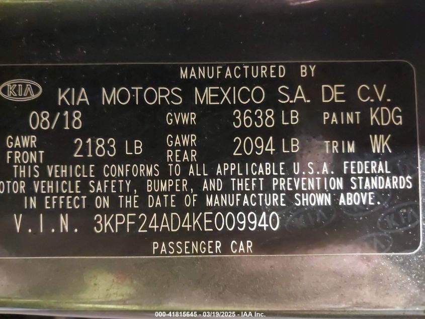2019 KIA FORTE 2019 року Бензин, 2.0, Передний привод, vin - 3KPF24AD4KE****** из США