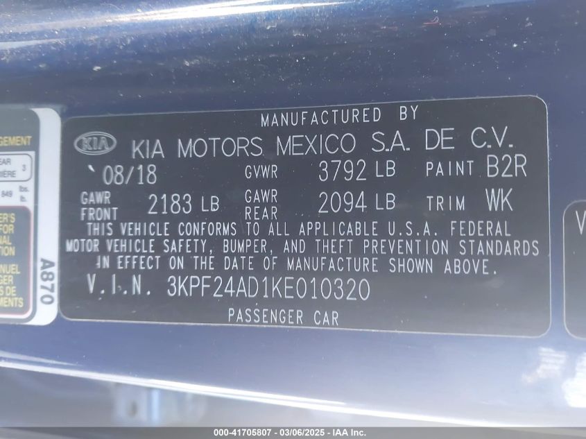 2019 KIA FORTE 2019 року Бензин, 2.0, Передний привод, vin - 3KPF24AD1KE****** из США