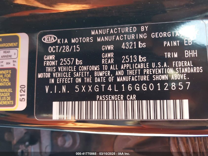 Цвет ЧерныйЦилиндры 4Привод Передний приводVIN 5XXGT4L16GG******Состояние НеизвестноПовреждения НезначительныеДата аукциона 2025-03-20 AutoRIA
