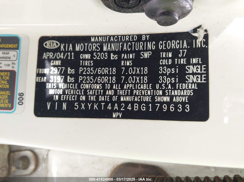 2011 KIA SORENTO 2011 року Бензин, 3.5, Передний привод, vin - 5XYKT4A24BG****** из США