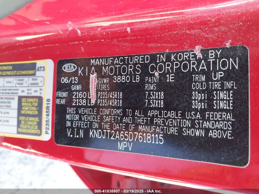 Цвет КрасныйЦилиндры 4Привод Передний приводVIN KNDJT2A65D7******Состояние НеизвестноПовреждения Правая сторона AutoRIA