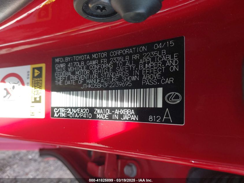 2015 LEXUS CT 200H 2015 року Гибрид, 1.8, Передний привод, vin - JTHKD5BH3F2****** из США