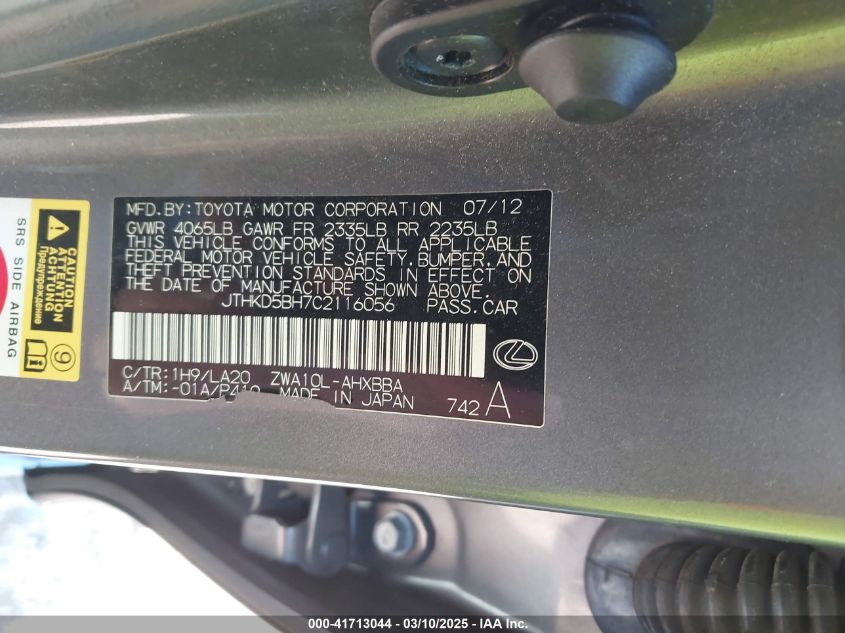 2012 LEXUS CT 200H 2012 року Гибрид, 1.8, Передний привод, vin - JTHKD5BH7C2****** из США