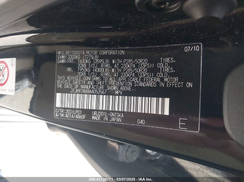 Цвет ЧерныйЦилиндры 8Привод Полный приводVIN JTJHY7AX8A4******Состояние НеизвестноПовреждения Передняя или задняяДата аукциона 2025-03-26 AutoRIA