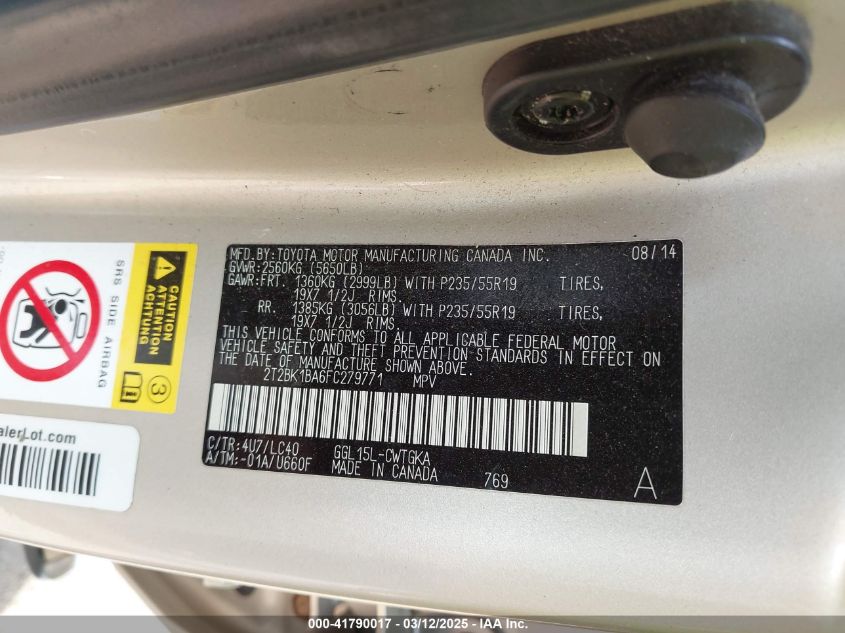 Цвет ЗолотойЦилиндры 6Привод Полный приводVIN 2T2BK1BA6FC******Состояние НеизвестноПовреждения Правая сторона AutoRIA