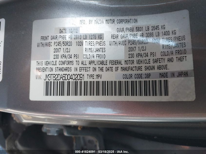 Цвет СеребряныйЦилиндры 6Привод Передний приводVIN JM3TB2DA6D0******Состояние НеизвестноПовреждения Левая сторонаДата аукциона 2025-03-20 AutoRIA
