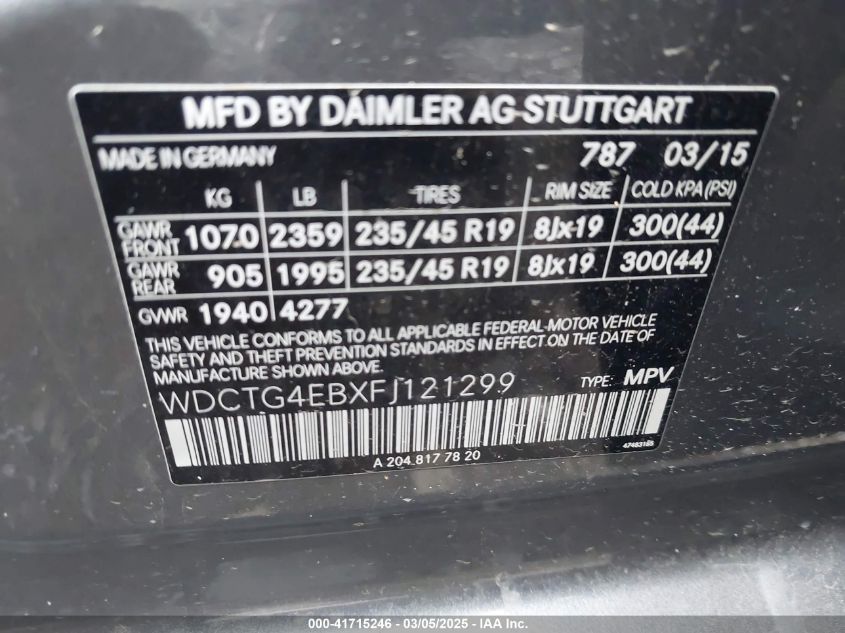 Цвет СерыйЦилиндры 4Привод Передний приводVIN WDCTG4EBXFJ******Состояние НеизвестноПовреждения Передняя или задняя AutoRIA