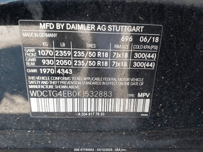 Цвет ЧерныйЦилиндры 4Привод Передний приводVIN WDCTG4EB0KJ******Состояние НеизвестноПовреждения Передняя или задняяДата аукциона 2025-03-25 AutoRIA