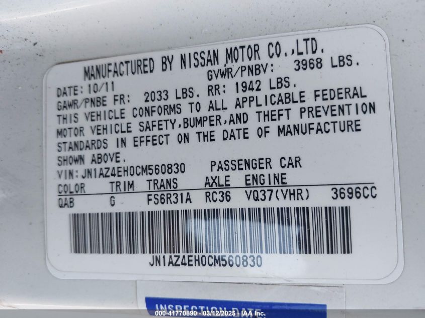 2012 NISSAN 370Z 2012 року Бензин, 3.7, Задний привод, vin - JN1AZ4EH0CM****** из США