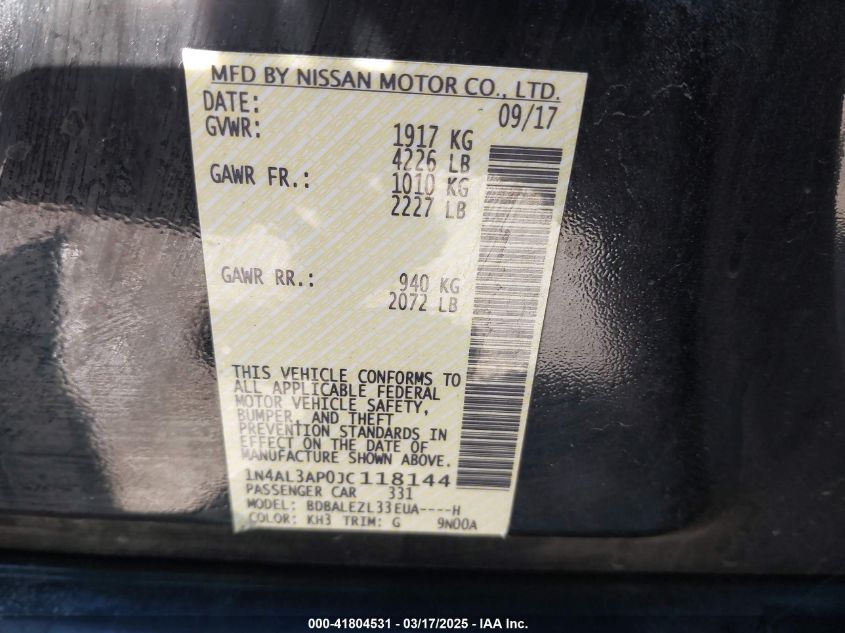Цвет ЧерныйЦилиндры 4Привод Передний приводVIN 1N4AL3AP0JC******Состояние НеизвестноПовреждения Задняя AutoRIA