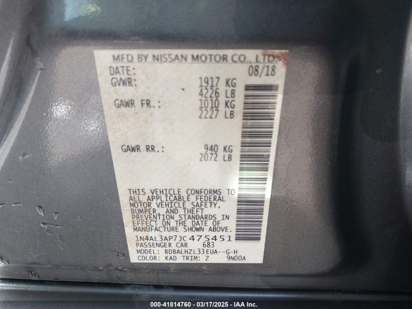 Цвет СерыйЦилиндры 4Привод Передний приводVIN 1N4AL3AP7JC******Состояние НеизвестноПовреждения Из-за непогоды AutoRIA