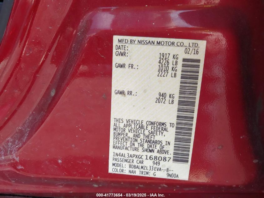 Цвет КрасныйЦилиндры 4Привод Передний приводVIN 1N4AL3APXGC******Состояние НеизвестноПовреждения Передняя правая AutoRIA
