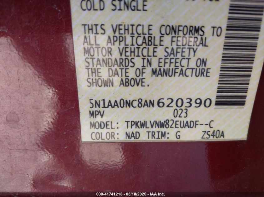 Цвет БургундияЦилиндры 8Привод Полный приводVIN 5N1AA0NC8AN******Состояние НеизвестноПовреждения ЗадняяДата аукциона 2025-03-25