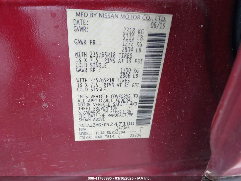 2015 NISSAN MURANO 2015 року Бензин, 3.5, Передний привод, vin - 5N1AZ2MG3FN****** из США