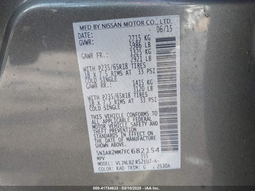 2015 NISSAN PATHFINDER 2015 року Бензин, 3.5, Полный привод, vin - 5N1AR2MM7FC****** из США