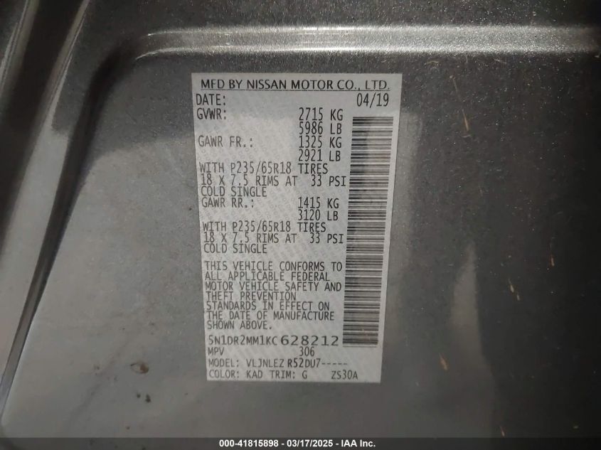 Цвет СерыйЦилиндры 6Привод Полный приводVIN 5N1DR2MM1KC******Состояние НеизвестноПовреждения Передняя или задняя AutoRIA