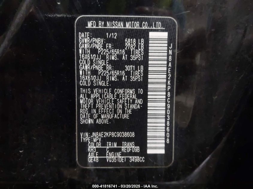 2012 NISSAN QUEST 2012 року Бензин, 3.5, Передний привод, vin - JN8AE2KP8C9****** из США