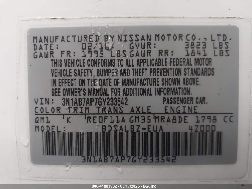 Цвет БелыйЦилиндры 4Привод Передний приводVIN 3N1AB7AP7GY******Состояние НеизвестноПовреждения Передняя или задняя AutoRIA