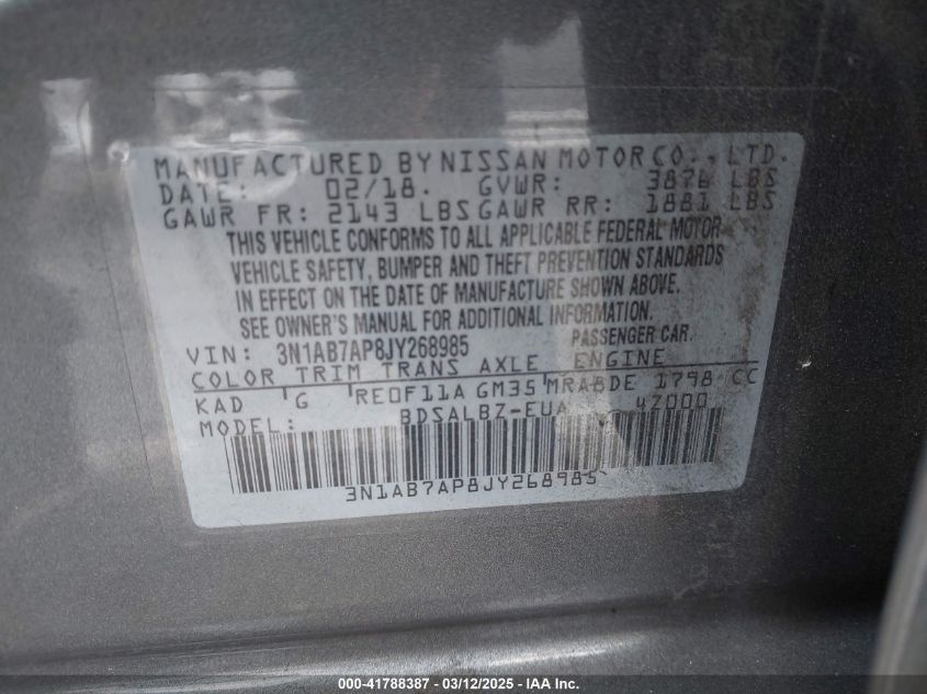 Цвет СерыйЦилиндры 4Привод Передний приводVIN 3N1AB7AP8JY******Состояние НеизвестноПовреждения НизДата аукциона 2025-03-20 AutoRIA